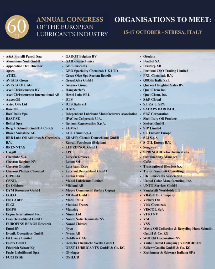 This congress will look to the future and explore how the lubricants industry can navigate our ever-changing world. Sessions will focus on global supply chains, sustainability, and digitalisation and AI.